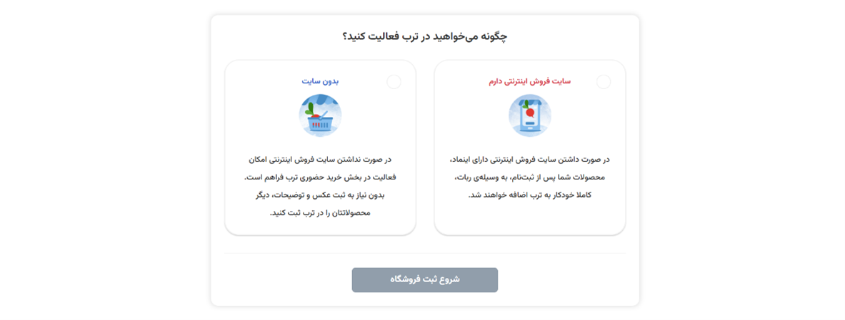 4. پس از تأیید شماره، از شما پرسیده میشود که نحوه فعالیت فروشگاهتان در ترب به چه صورت خواهد بود: