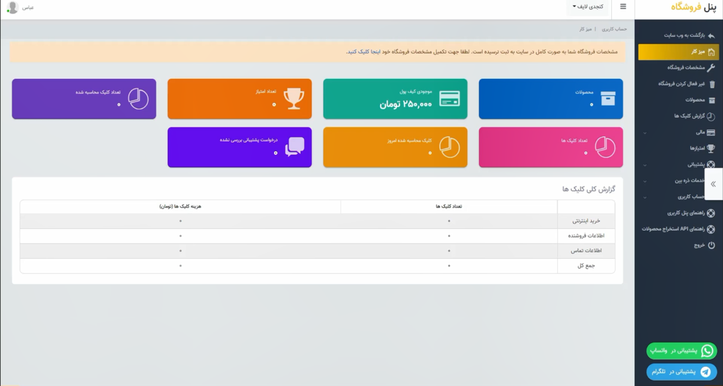 بعد از دریافت پیامک تأیید، با ورود به پنل کاربری ذرهبین، پیغامی به شما نمایش داده میشود تا مشخصات فروشگاه خود را تکمیل کنید. برای این کار از منوی کناری، گزینه مشخصات فروشگاه را انتخاب کنید.