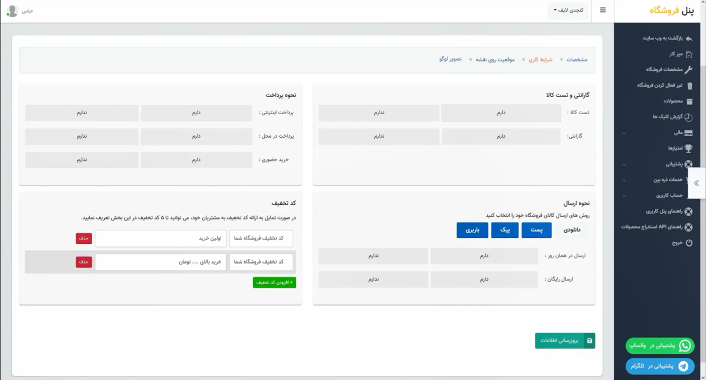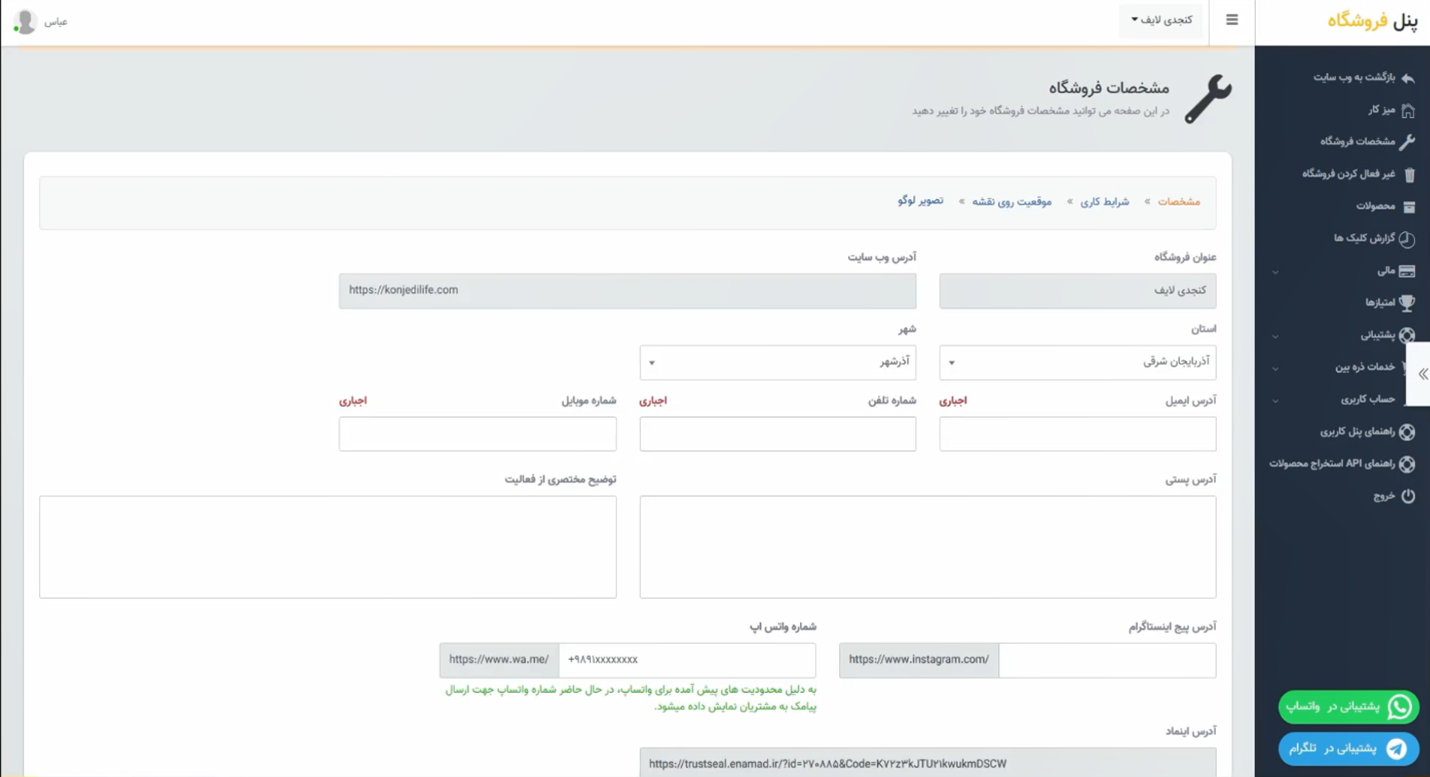 در بخش مشخصات، اطلاعات فروشگاه اینترنتی خود را دقیق وارد کنید (نام، آدرس، توضیحات، اطلاعات تماس و...). سپس گزینه بهروزرسانی اطلاعات را انتخاب کنید.