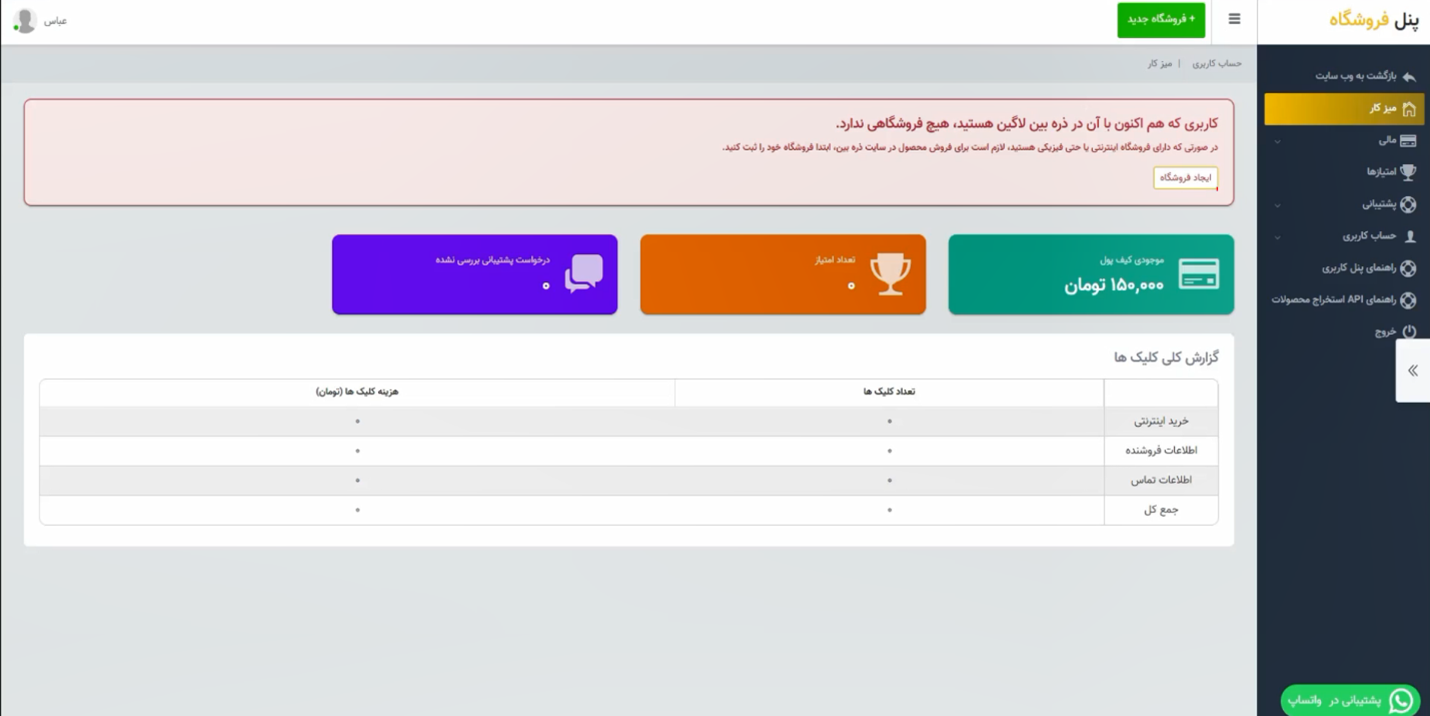 در این بخش پیغامی نمایش داده میشود مبنی بر اینکه کاربری که اکنون در ذرهبین وارد شده، هیچ فروشگاهی ندارد. کافی است روی گزینه ایجاد فروشگاه کلیک کنید