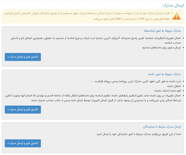 - امور دامنه: مربوط به همه موارد ثبت دامنه مانند تعهد کتبی، روزنامه رسمی، آگهی تغییرات، انتقال دامنه به شخص دیگر، حذف دامنه و هرگونه تغییراتی که بهصورت عادی توسط کاربر قابل انجام نیست.