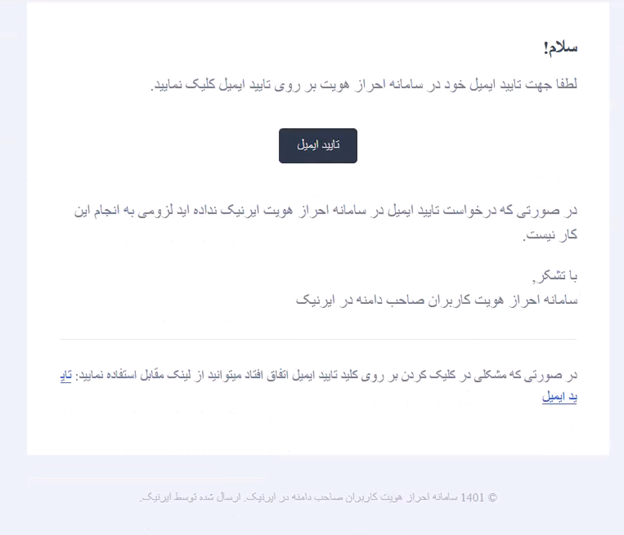 ایمیلی از ایرنیک دریافت خواهید کرد (اگر ایمیل را در صندوق ورودی نمیبینید، پوشه Spam یا Junk را هم بررسی کنید)، آن را بررسی و تأیید کنید تا این مرحله تکمیل شود.